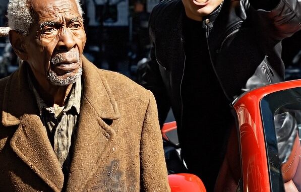 Then the atmosphere shifts. A bright red convertible pulls into view, drawing immediate attention. Behind the wheel is a younger man dressed in a black leather jacket and dark sunglasses. His entrance is loud, polished, and impossible to miss. On the surface, he appears to embody confidence and success. Yet what follows quickly reveals that appearances can be deeply misleading.