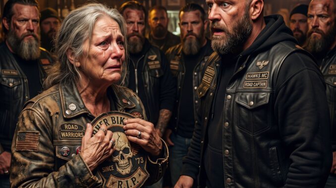 She had gray hair, a brown leather jacket, and the kind of tired expression that suggested she had traveled a long way. She did not look lost, but several men in the room treated her like she must be. A bald biker near the center smirked and leaned back in his chair as if he already knew how the moment would end.