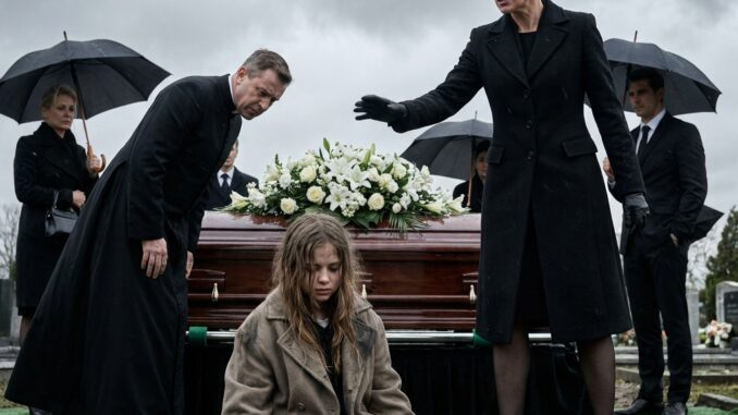 She could not have been more than eight years old. Her coat was torn. Her shoes were damp and worn thin. In her trembling hands, she carried a single white flower tied with a black ribbon. She looked tiny beside the grave, frightened by the crowd but holding herself together with the kind of determination children should never need.